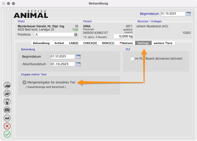 - Klicken Sie im Behandlungslayout auf den TAB „weitere Tiere“
